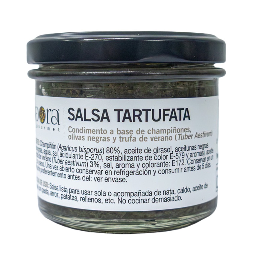 Salsa elaborada con champiñón, aceitunas negras y trufa de verano (Tuber aestivum). Lista para usar sola o acompañada de nata, caldo, aceite de oliva, etc.