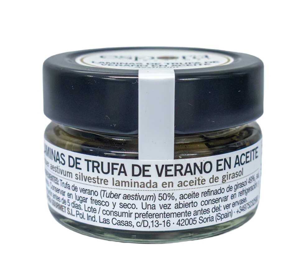 Finas láminas de trufa de verano (Tuber aestivum) seleccionadas y mezcladas con un suave aceite de girasol aromatizado al punto de sal.