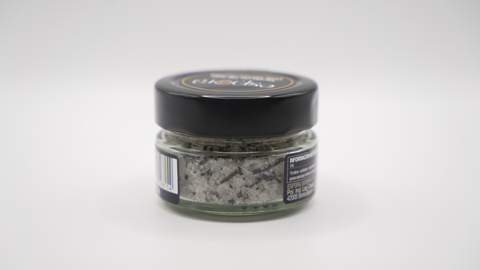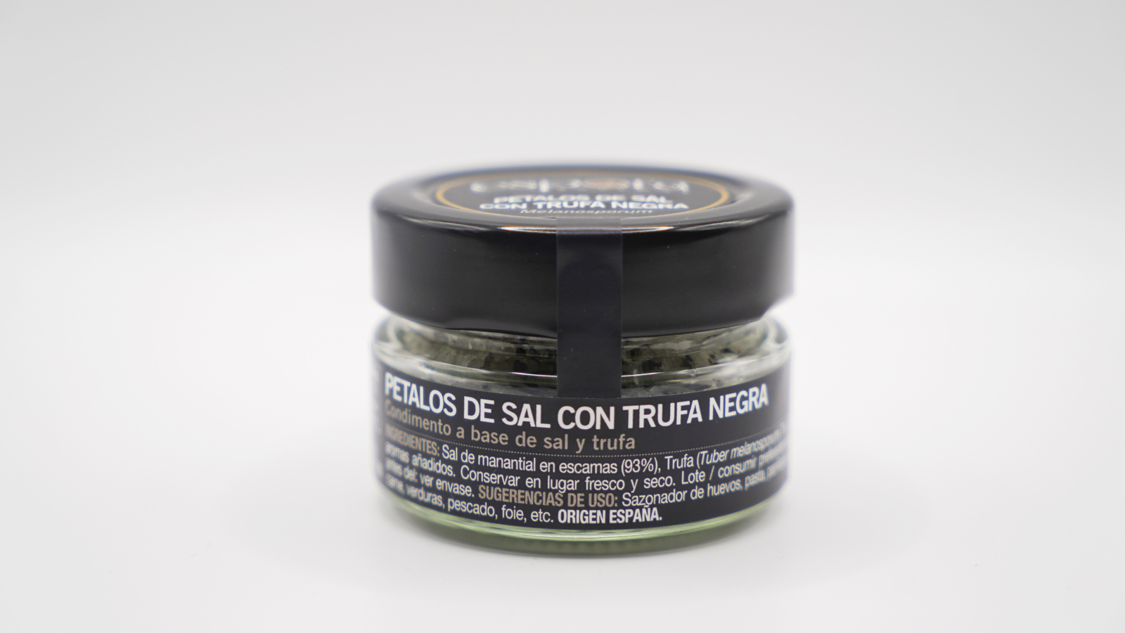 Sal de manantial cristalizada en escamas con trufa natural de la variedad tuber melanosporum (trufa negra de invierno), de suave sabor y olor a trufa.